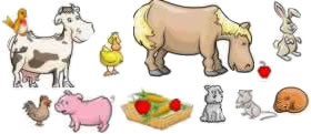 A bird, a cow, a duck, a horse, a rabbit, a chicken, a pig, a mouse, a dog, and a cat live on a little farm.