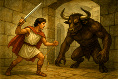 Theseus went into the maze alone. The dark halls twisted and turned, but he kept going until he found the Minotaur. With his sword, he fought and killed the evil creature.