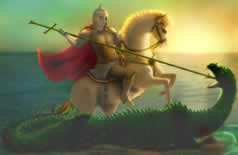 When the brave knight George heard about this, he rode on his horse as fast as he could. Just as the dragon was about to eat the princess, George arrived. He made the sign of the cross to show he was a Christian, fought and killed the dragon and rescued the princess. The villagers were so impressed with his bravery that they all became Christians.
